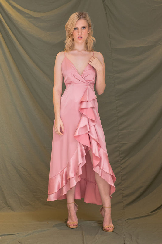 LAS PALMAS Deep V Wrap Midi Dress with Cascading Ruffles (Rose Pink Silk)Regular price ₱3,590.00Regular priceUnit price / per-