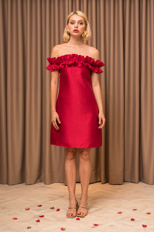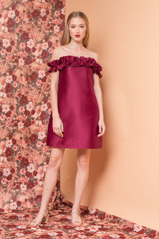 ROSA Gazaar Mini Dress with Overized Off Shoulder Ruffles (Dark Maroon Gazaar)Regular price ₱4,299.00Regular priceUnit price / per-