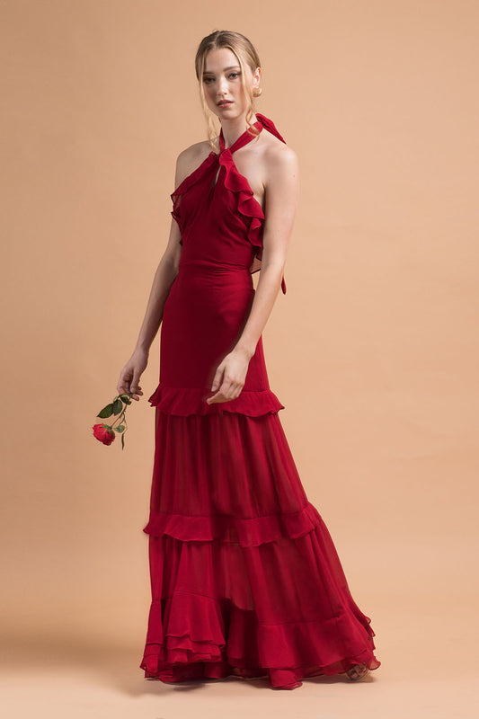 HERMOSA Chiffon Maxi with Layered Ruffles and Tie Back (Maroon Chiffon)Regular price ₱6,990.00Regular priceUnit price / per-