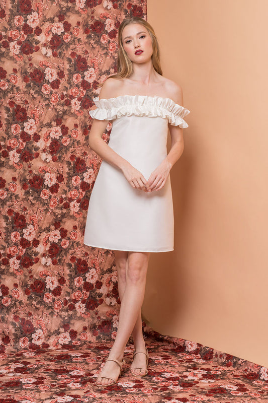 ROSA Gazaar Mini Dress with Overized Off Shoulder Ruffles (White Gazaar)Regular price ₱4,299.00Regular priceUnit price / per-