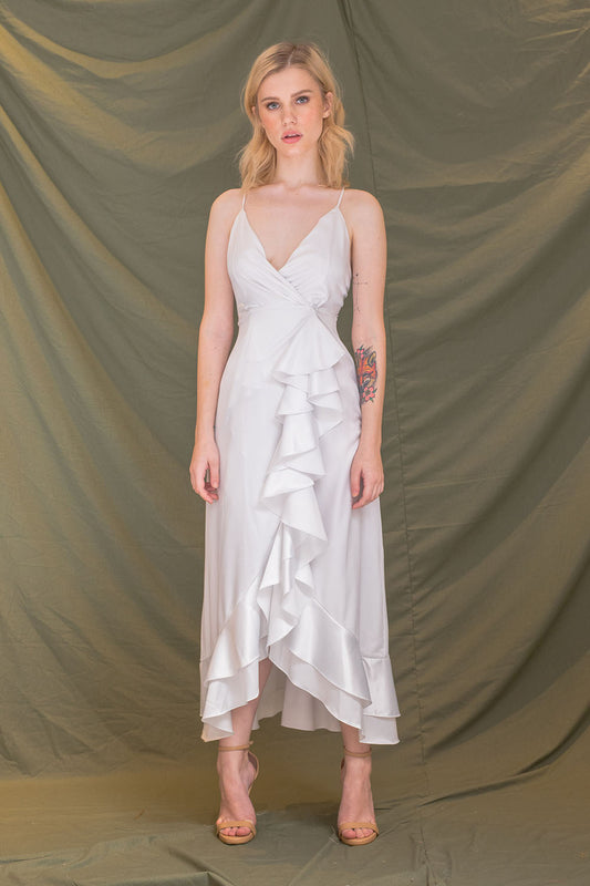 LAS PALMAS Deep V Wrap Midi Dress with Cascading Ruffles (White Silk)Regular price ₱3,590.00Regular priceUnit price / per-