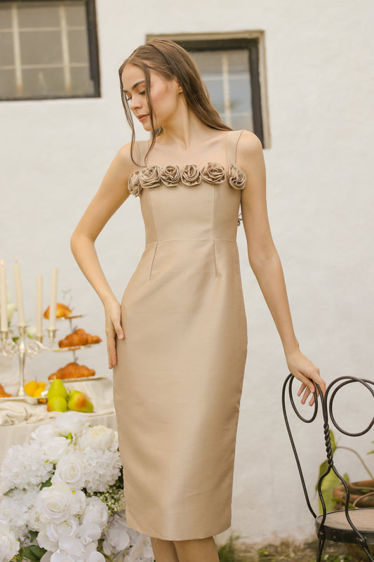 Giselle Strappy Pencil Cut Midi Dress with Flowers on Neckline (Tan Gazaar)