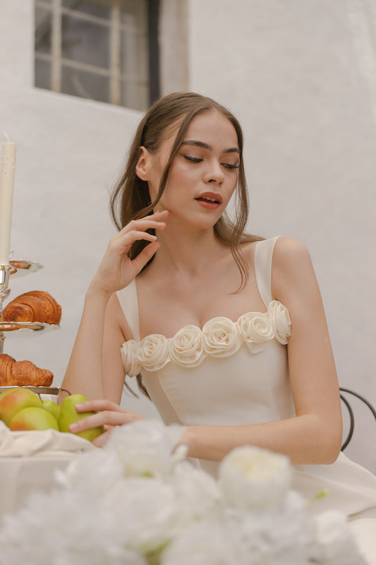 HELENE Strappy Straight Cut Gown with Flowers on Neckline (Ivory White Gazaar)