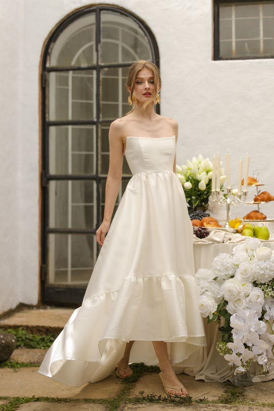 MADELEINE Strapless High Low Gown with Ruffle Hem (Ivory White Gazaar)