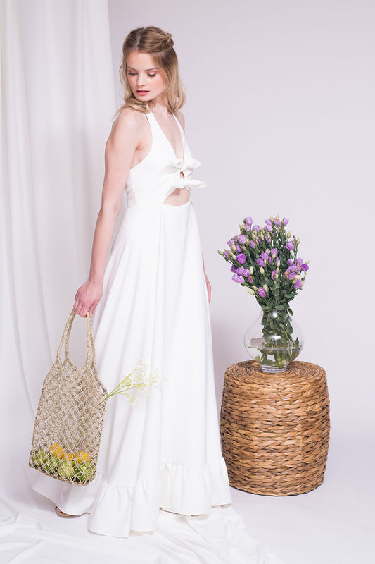 MERIDA Double Bow Halter Maxi Dress with Ruffled Hem (White)