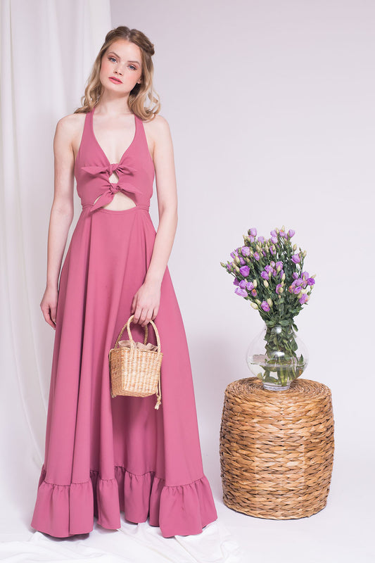 MERIDA Double Bow Halter Maxi Dress with Ruffled Hem (Old Rose )
