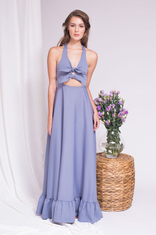 MERIDA Double Bow Halter Maxi Dress with Ruffled Hem (Serenity Blue)