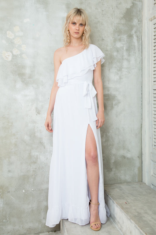 BONITA One Sided Ruffle Maxi Dress with Slit (White)