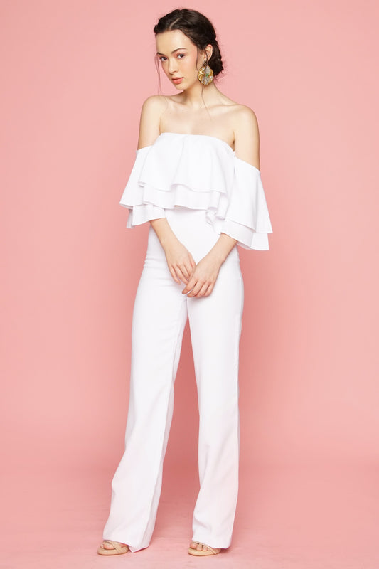 EMILIA PANTS SET: Layered Off Shoulder Top + Straight Cut Trouser (White)