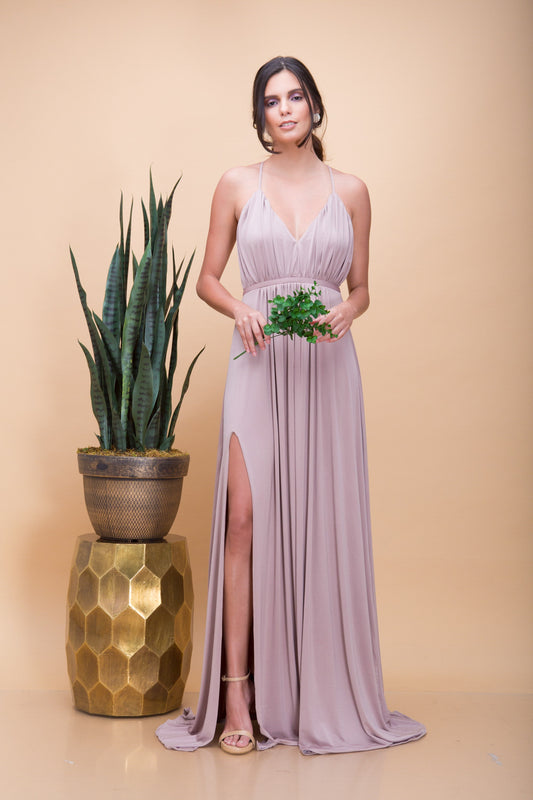 ROMANICA Plunge Front Crossed Back Maxi Dress with High Slit (Dusty Rose)