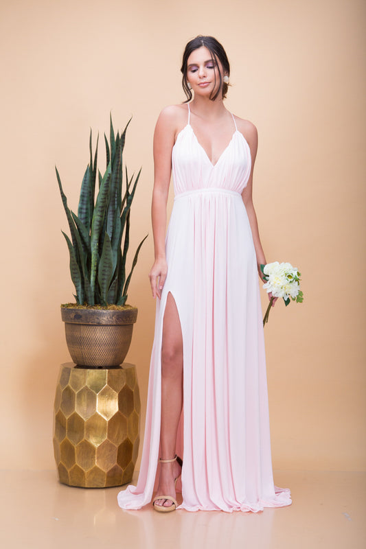 ROMANICA Plunge Front Crossed Back Maxi Dress with High Slit (Rose Quartz)