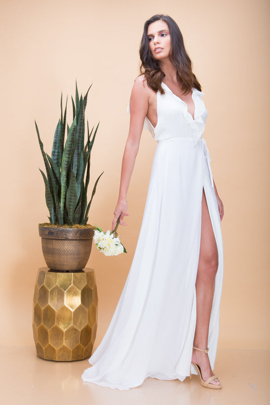 FLORENCE Ruffle Chiffon Maxi Dress with Wrap Skirt (White)
