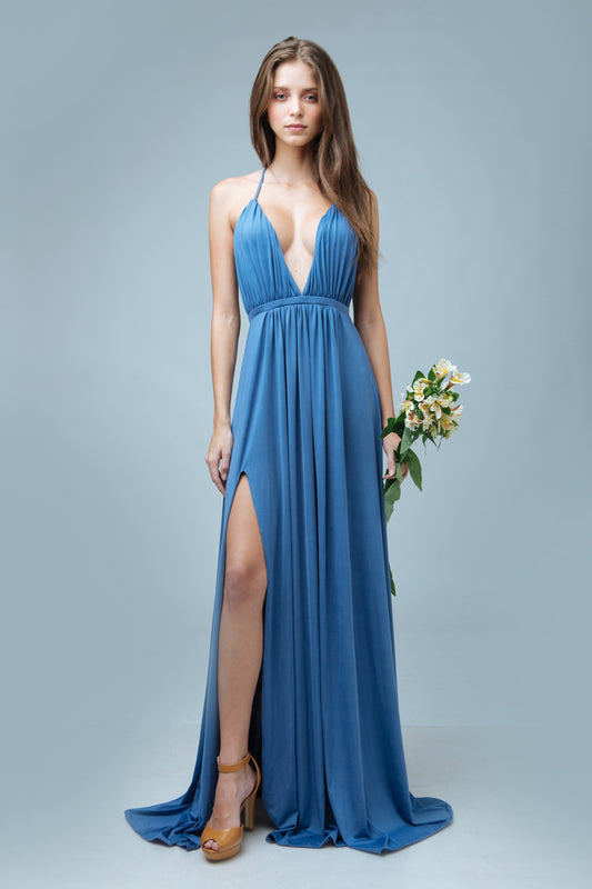 TO BE ADORED Plunge Front Crossed Back Maxi Dress with High Slit (Serenity Blue-Color of the Year)