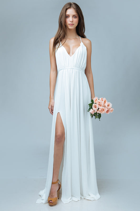 ROMANICA Plunge Front Crossed Back Maxi Dress with High Slit (White)