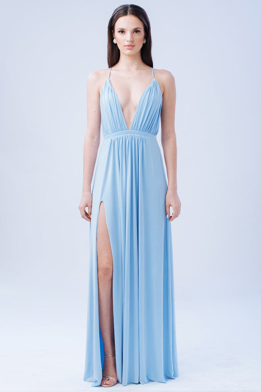 TO BE ADORED Plunge Front Crossed Back Maxi Dress with High Slit (Powder Blue)