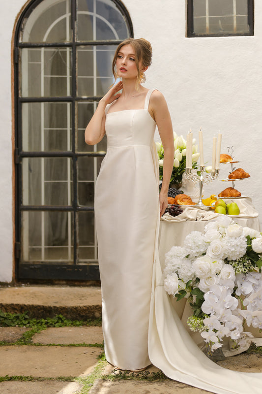 GABRIELA Strappy Straight Cut Gown with Detachable Bow Trail (Ivory White Gazaar)