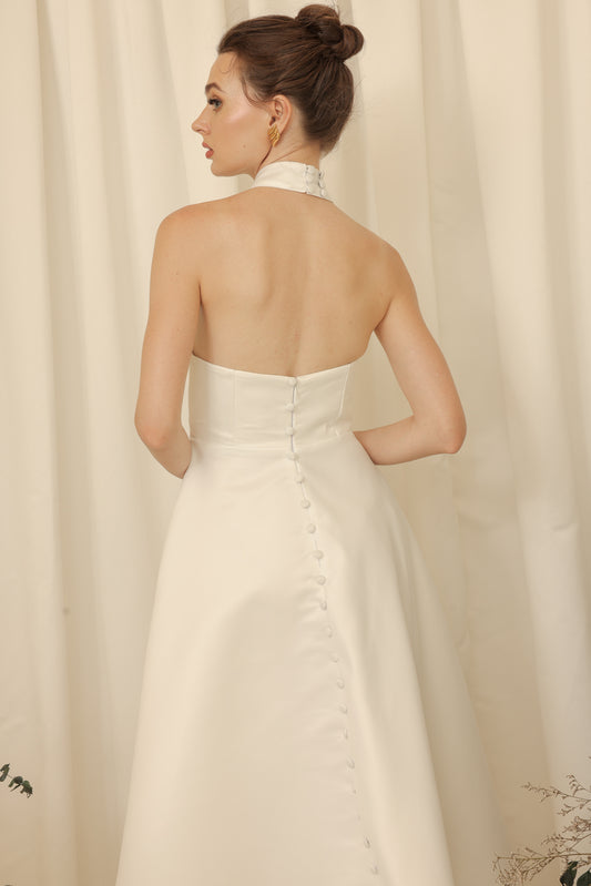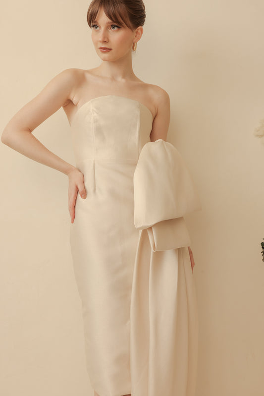 BRIELLE Curve Neckline Midi Dress with Full Covered Button Back and Tie Neckpiece (Ivory White Duchess Satin)