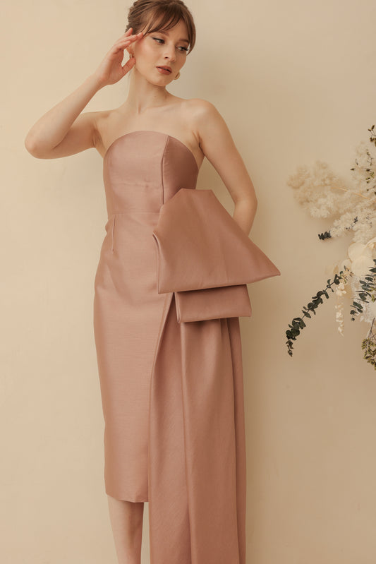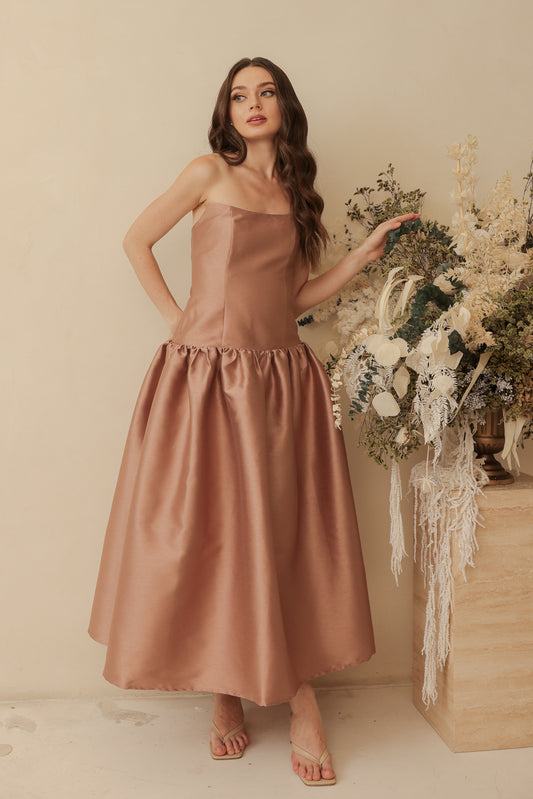 PROVENCE Strapless Drop Waist Midi Dress (Taupe Gazaar)