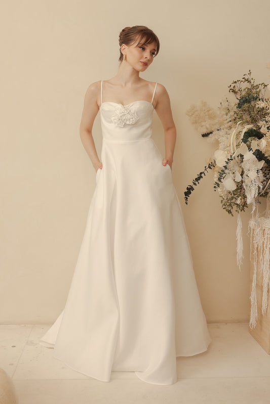 ADELINE Strappy Maxi Dress with Mini Trail and Pockets and Trio Floral Detail (Ivory White Duchess Satin)