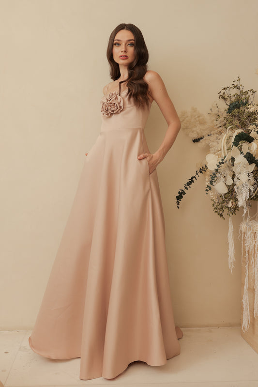 ADELINE Strappy Maxi Dress with Mini Trail and Pockets and Trio Floral Detail (Blush Nude Duchess Satin)
