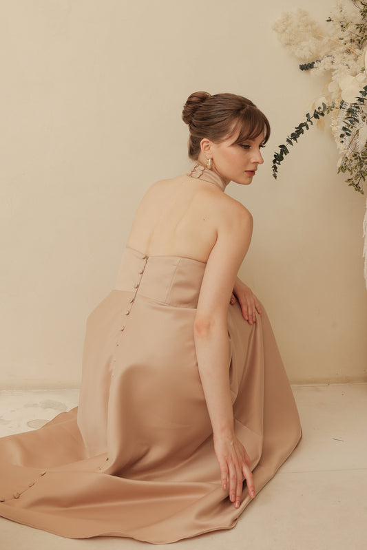 BRIELLE Curve Neckline Midi Dress with Full Covered Button Back and Tie Neckpiece (Blush Nude Duchess Satin)