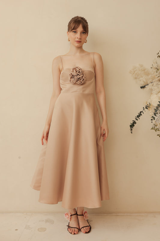 AIMEE Strappy Midi Dress with Pockets and Trio Floral Detail (Tan Duchess Satin)