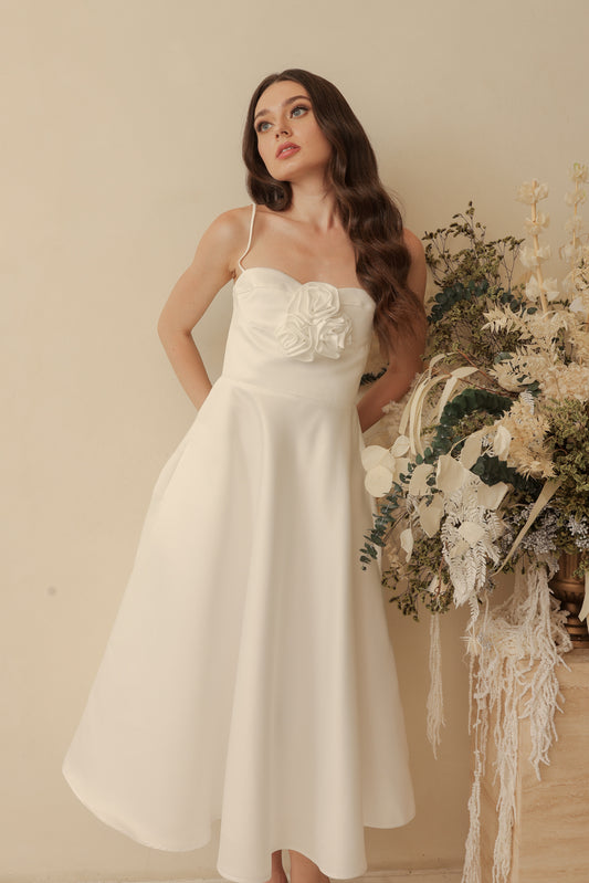 AIMEE Strappy Midi Dress with Pockets and Trio Floral Detail (Ivory White Duchess Satin)