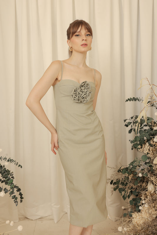 CHLOE Strappy Pencil Cut Midi Dress with Pockets and Trio Floral Detail (Light Sage Linen Blend)