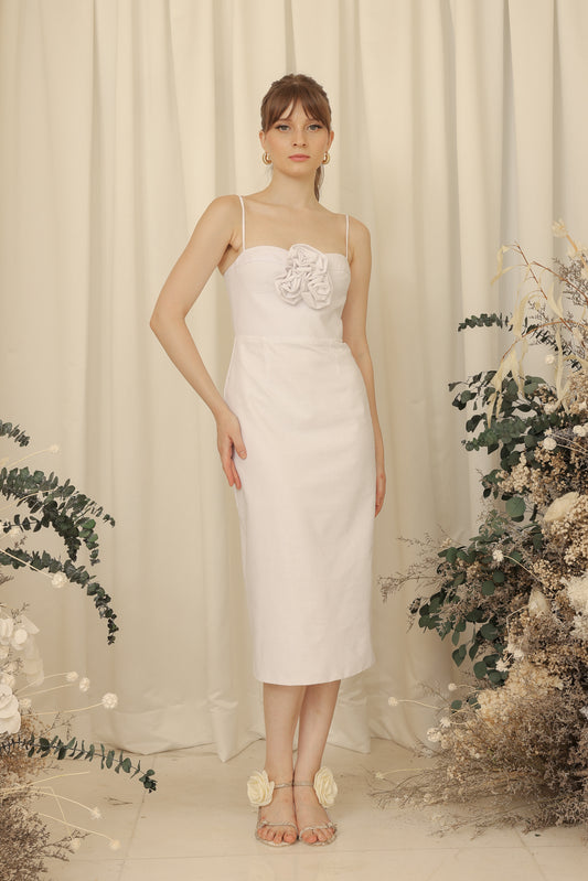 CHLOE Strappy Pencil Cut Midi Dress with Pockets and Trio Floral Detail (Ivory White Linen Blend)