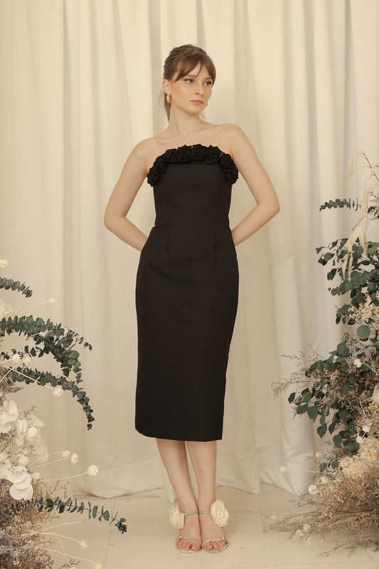 ANGELIQUE Curve Neckline Midi Pencil Skirt Dress with Full Floral Detail on Neckline (Black Linen Blend)