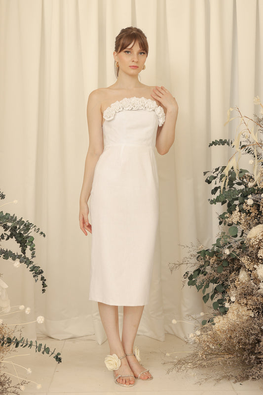 ANGELIQUE Curve Neckline Midi Pencil Skirt Dress with Full Floral Detail on Neckline (Ivory White Linen Blend)