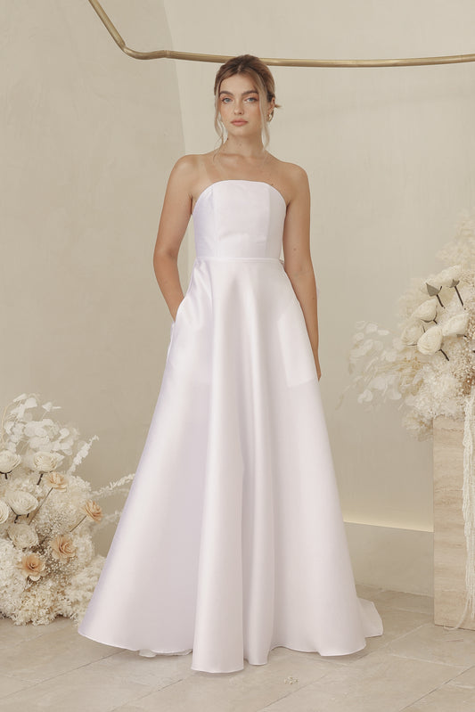 CAROLINE Strapless Curved Neckline Full Length Gown with Bow, Pockets and Covered Buttons (White Gazaar)