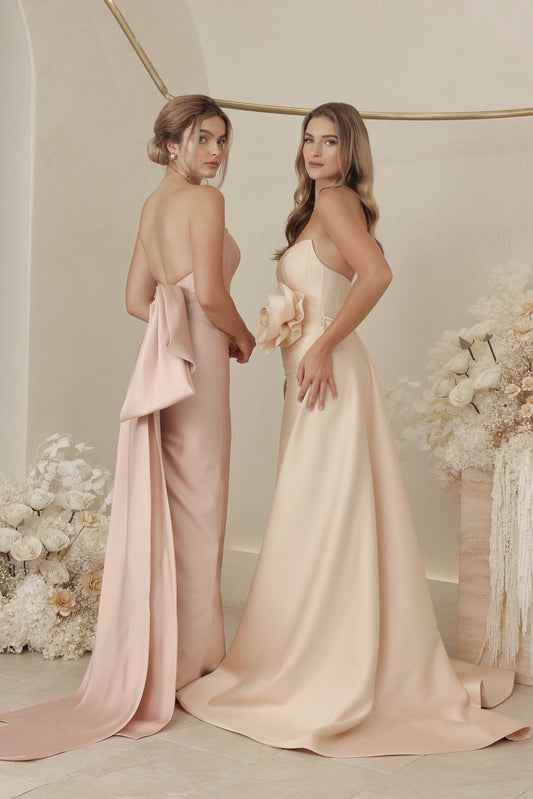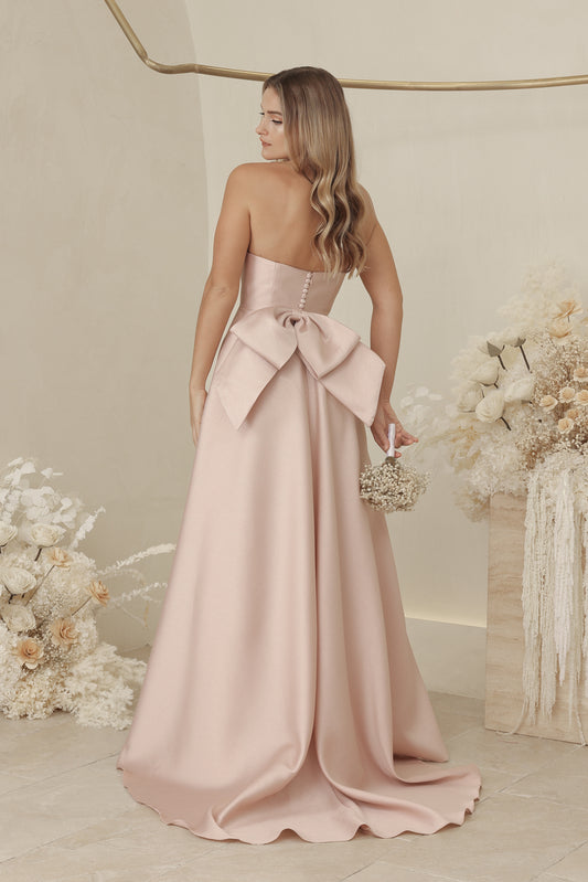 CAROLINE Strapless Curved Neckline Full Length Gown with Bow, Pockets and Covered Buttons (Blush Gazaar)
