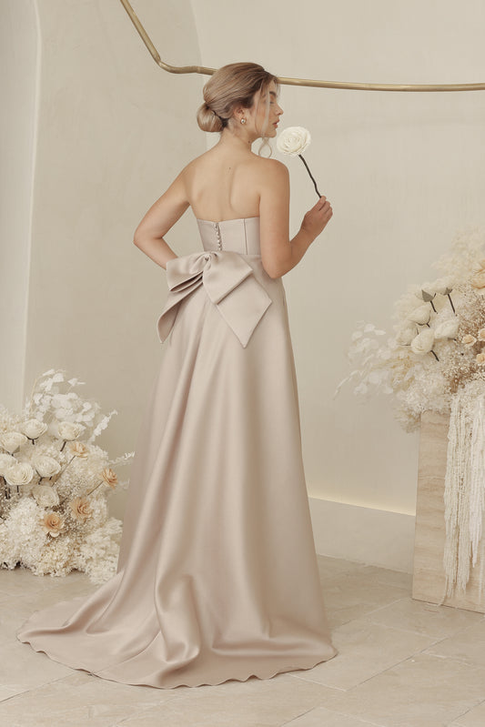 CAROLINE Strapless Curved Neckline Full Length Gown with Bow, Pockets and Covered Buttons (Tan Gazaar)
