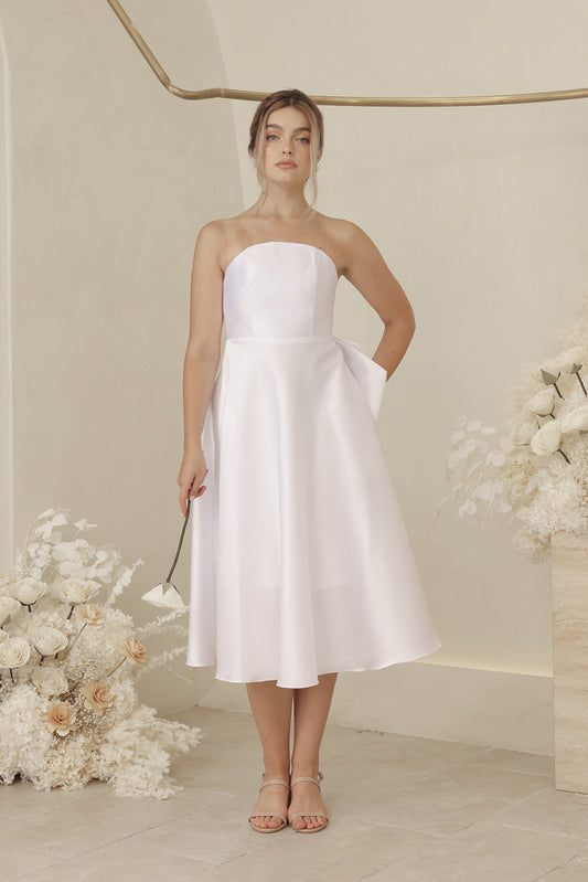 CELINE Strapless Curved Neckline Mid Length Gown with Bow, Pockets and Covered Buttons (White Gazaar)