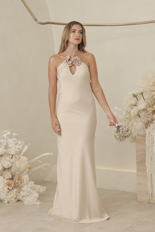 ANTOINETTE Full Length Silk Dress with Two Floral Detail on Neckline and Open Back (Nude Silk Crepe)