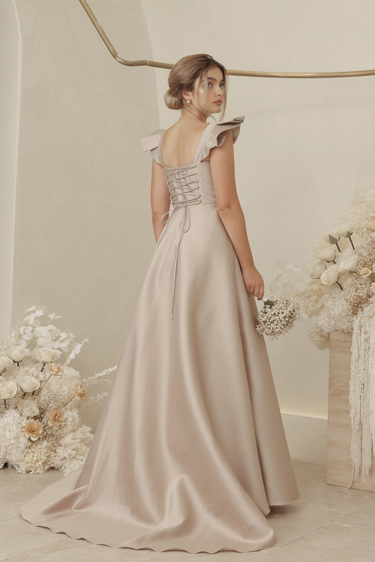 CLEMENCE Ruffle Sleeve Full Length Gown with Lace Up Back Detail and Mini Trail (Tan Gazaar)Regular price ₱8,499.00Regular priceUnit price / per-