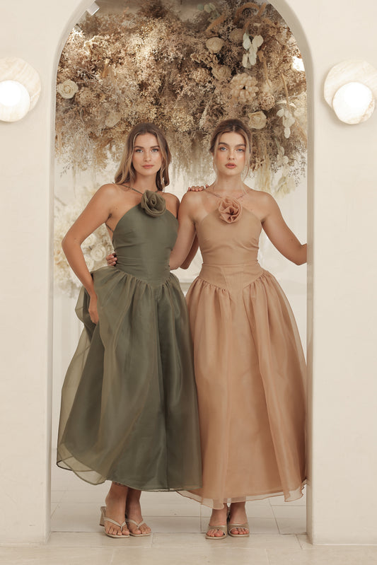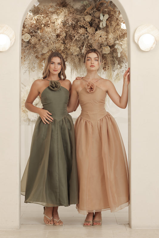 CELESTE Sleeveless Baroque Style Waist Midi Dress with Floral Detail on Neckline (Tan Organza)Regular price ₱4,999.00Regular priceUnit price / per-