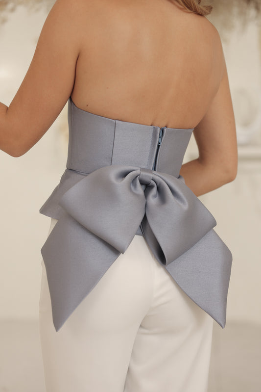 RUBY TOP Strapless Curved Neckline Peplum Top with Bow Back (Dusty Blue Gazaar)Regular price ₱4,450.00Regular priceUnit price / per-