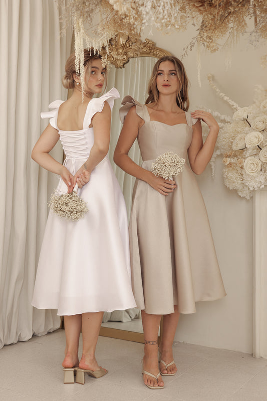 CLAIRE Curved Neckline Strappy Mini Gown with Bow Back (Tan Gazaar)Regular price ₱5,999.00Regular priceUnit price / per-