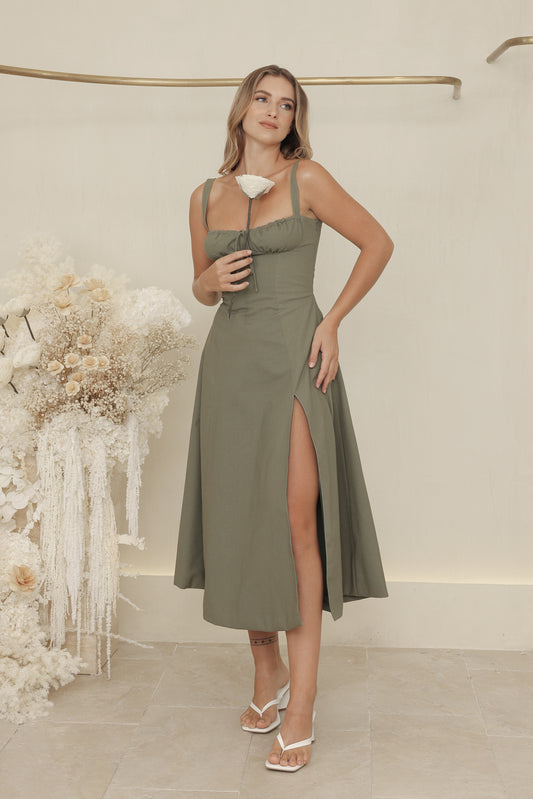 AMOUR Strappy Corset Style Midi Dress with Lace Up Back Detail (Olive Linen)Regular price ₱3,690.00Regular priceUnit price / per