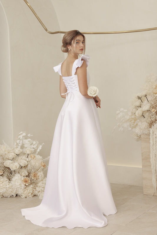 CLEMENCE Ruffle Sleeve Full Length Gown with Lace Up Back Detail and Mini Trail (Ivory White Gazaar)Regular price ₱8,499.00Regular priceUnit price / per-