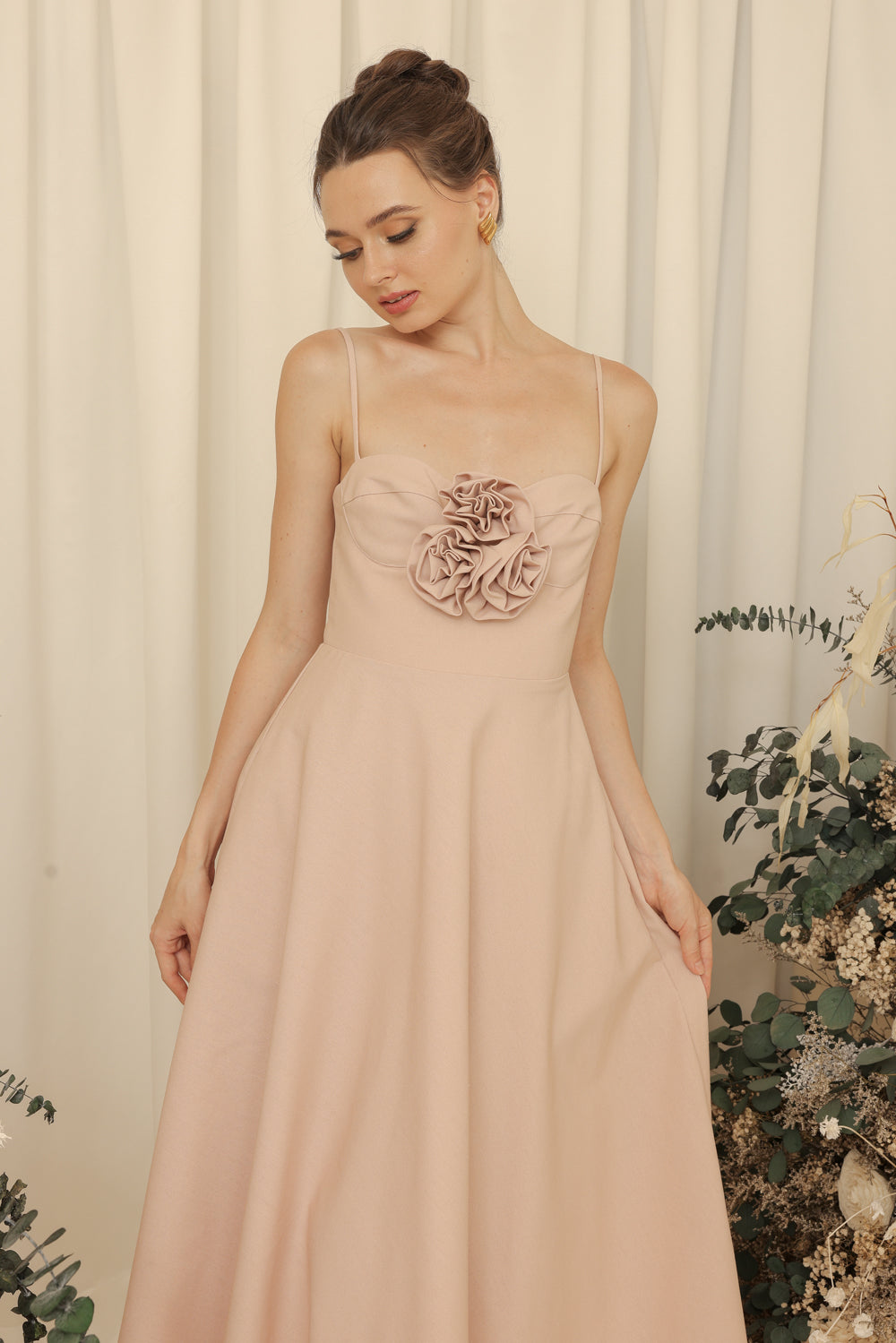 AIMEE Strappy Midi Dress with Pockets and Trio Floral Detail (Blush Linen Blend)