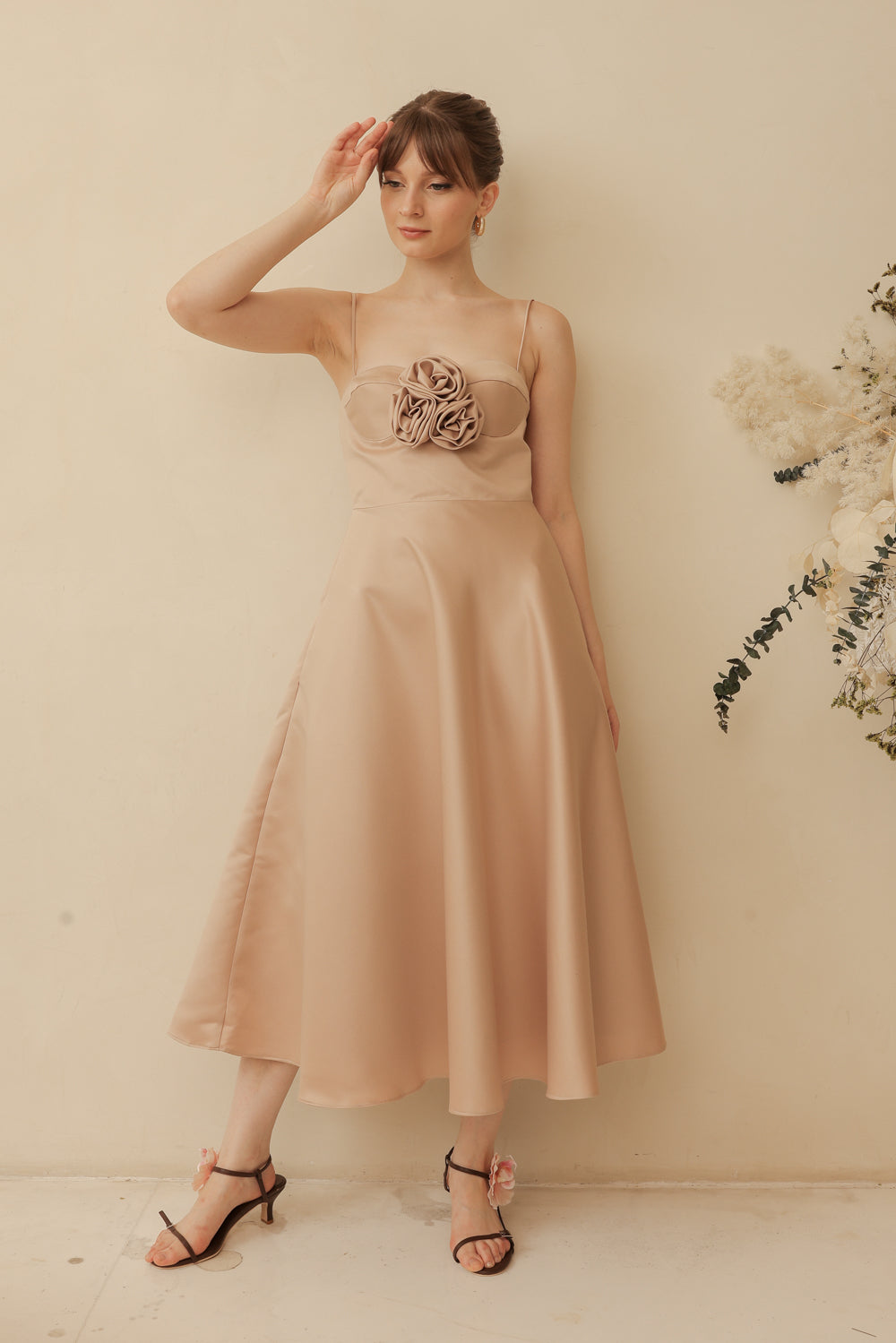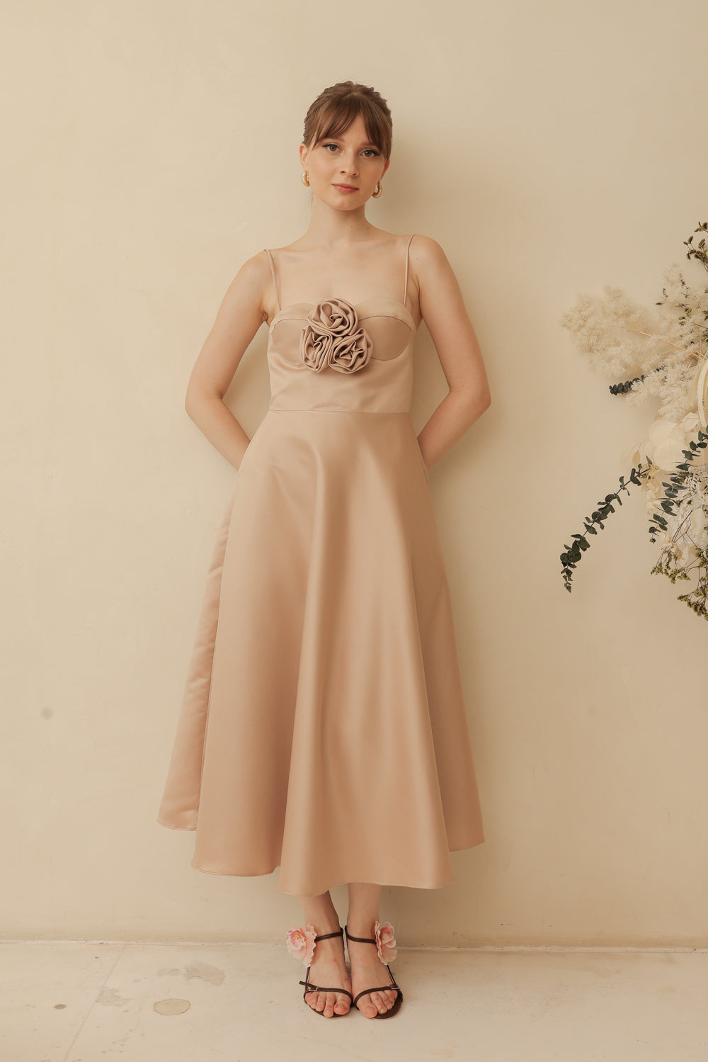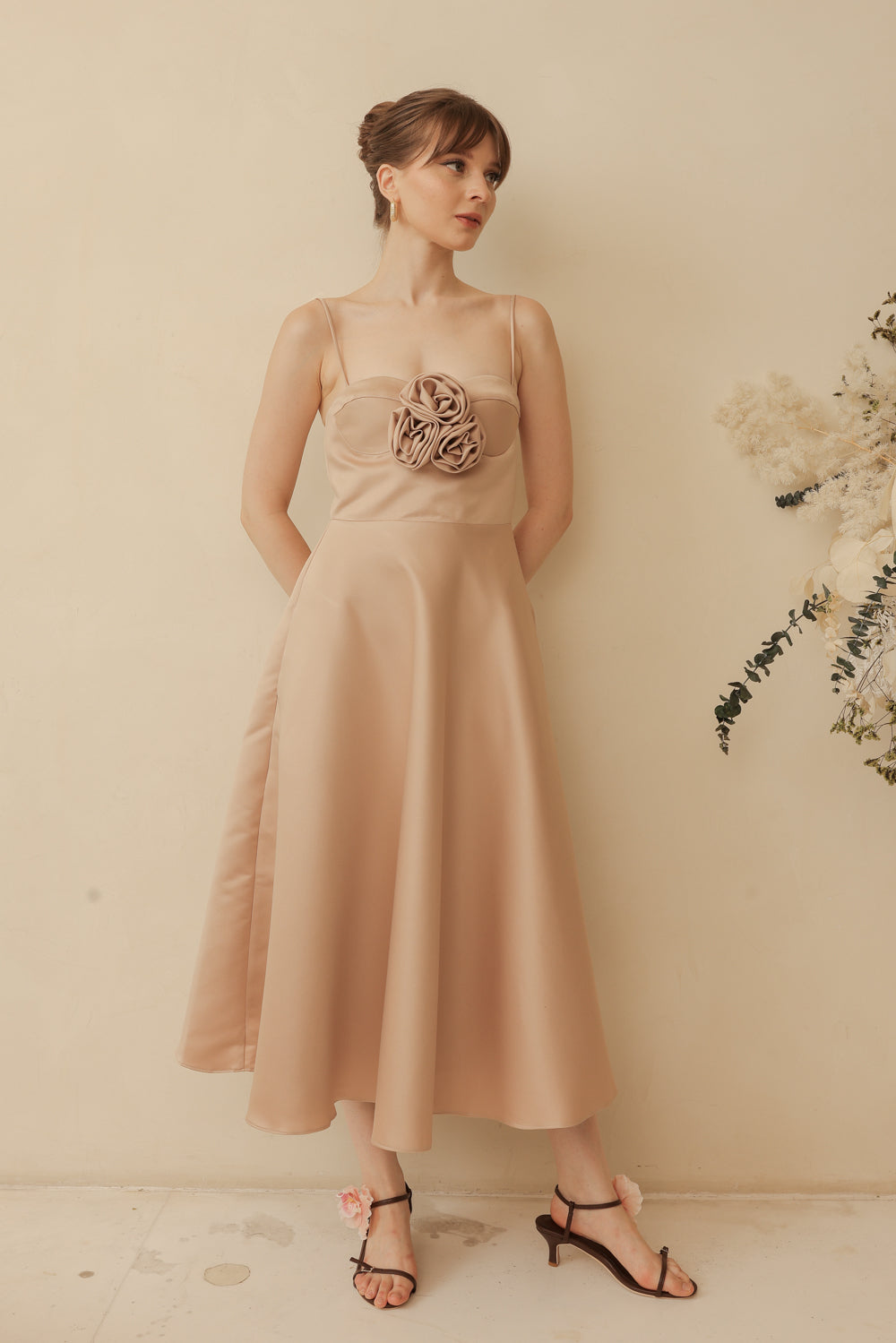 AIMEE Strappy Midi Dress with Pockets and Trio Floral Detail (Tan Duchess Satin)