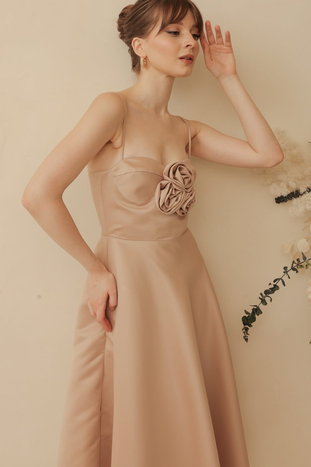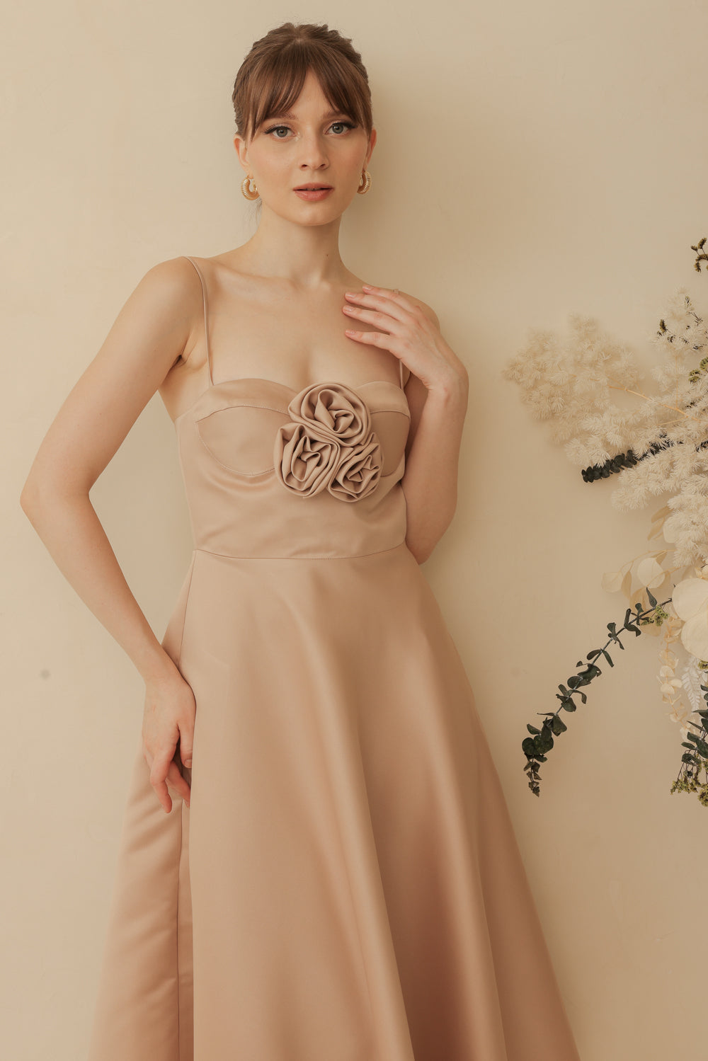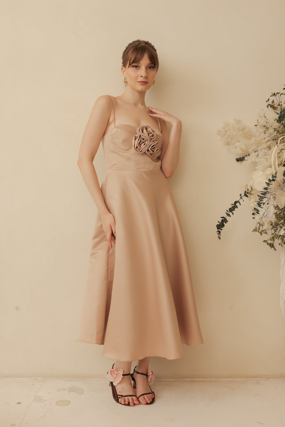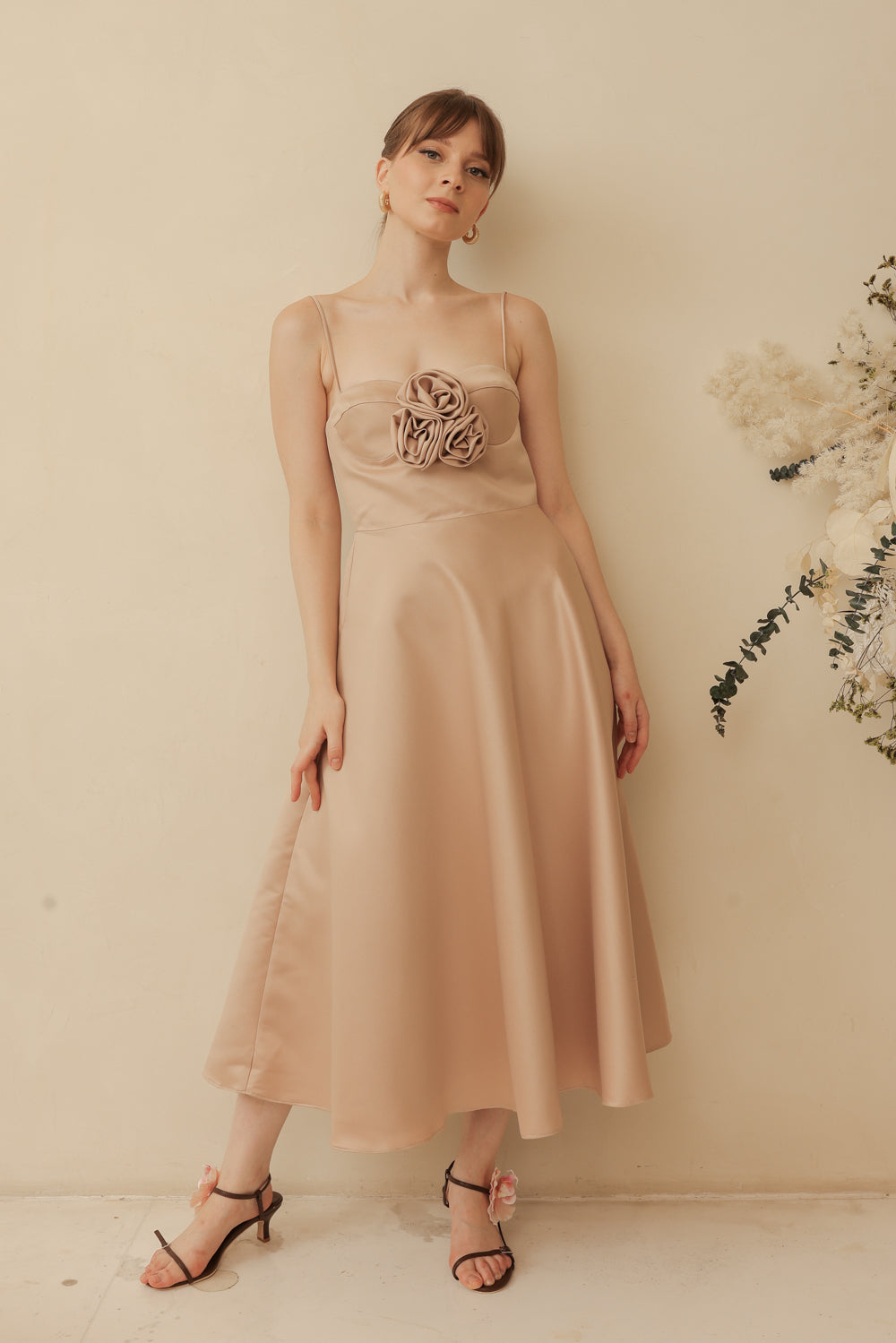 AIMEE Strappy Midi Dress with Pockets and Trio Floral Detail (Tan Duchess Satin)