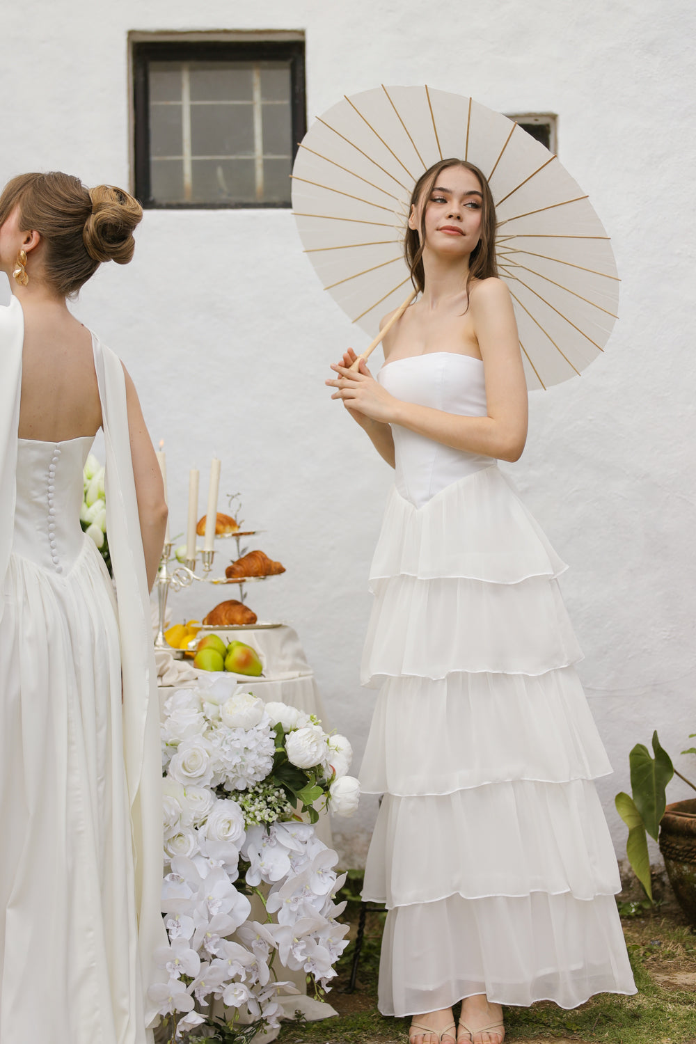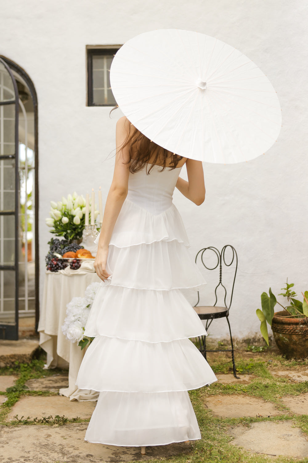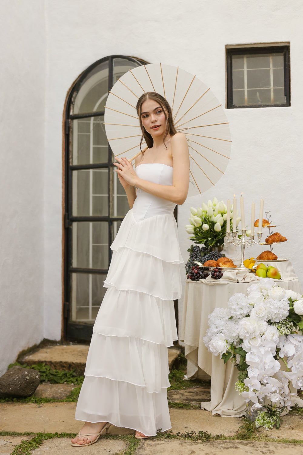 AURORA Strapless Drop Waist Maxi Dress with Layered Skirt (Ivory White Chiffon)