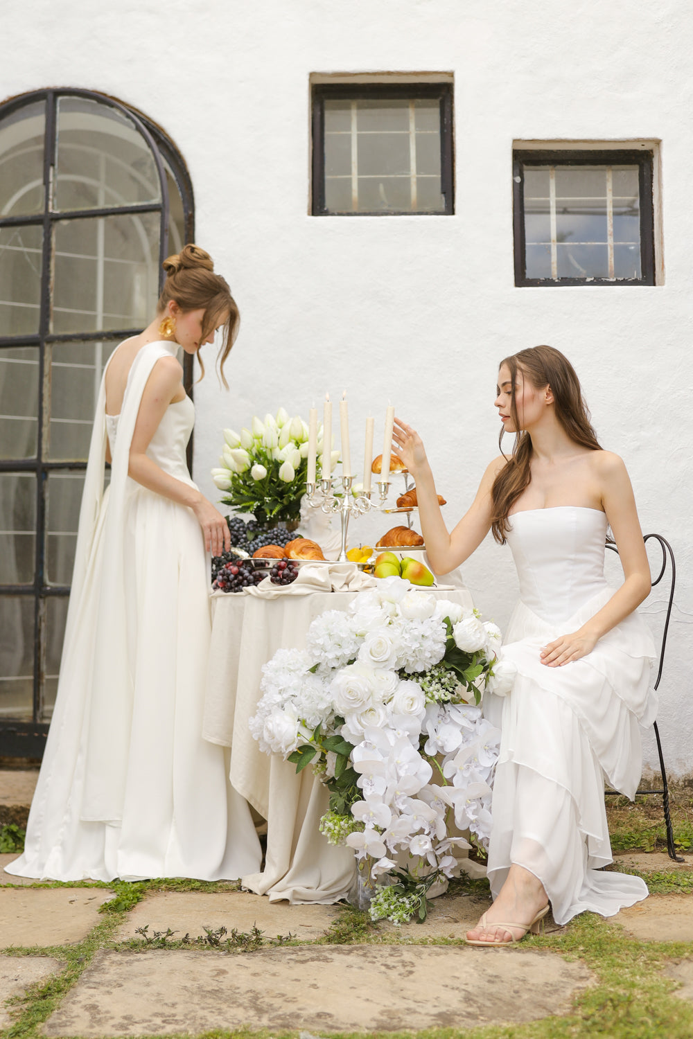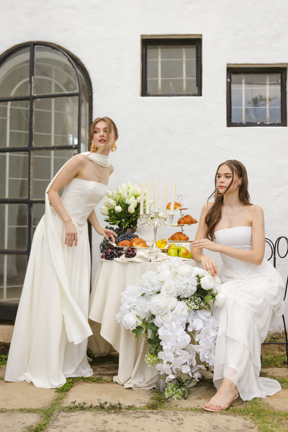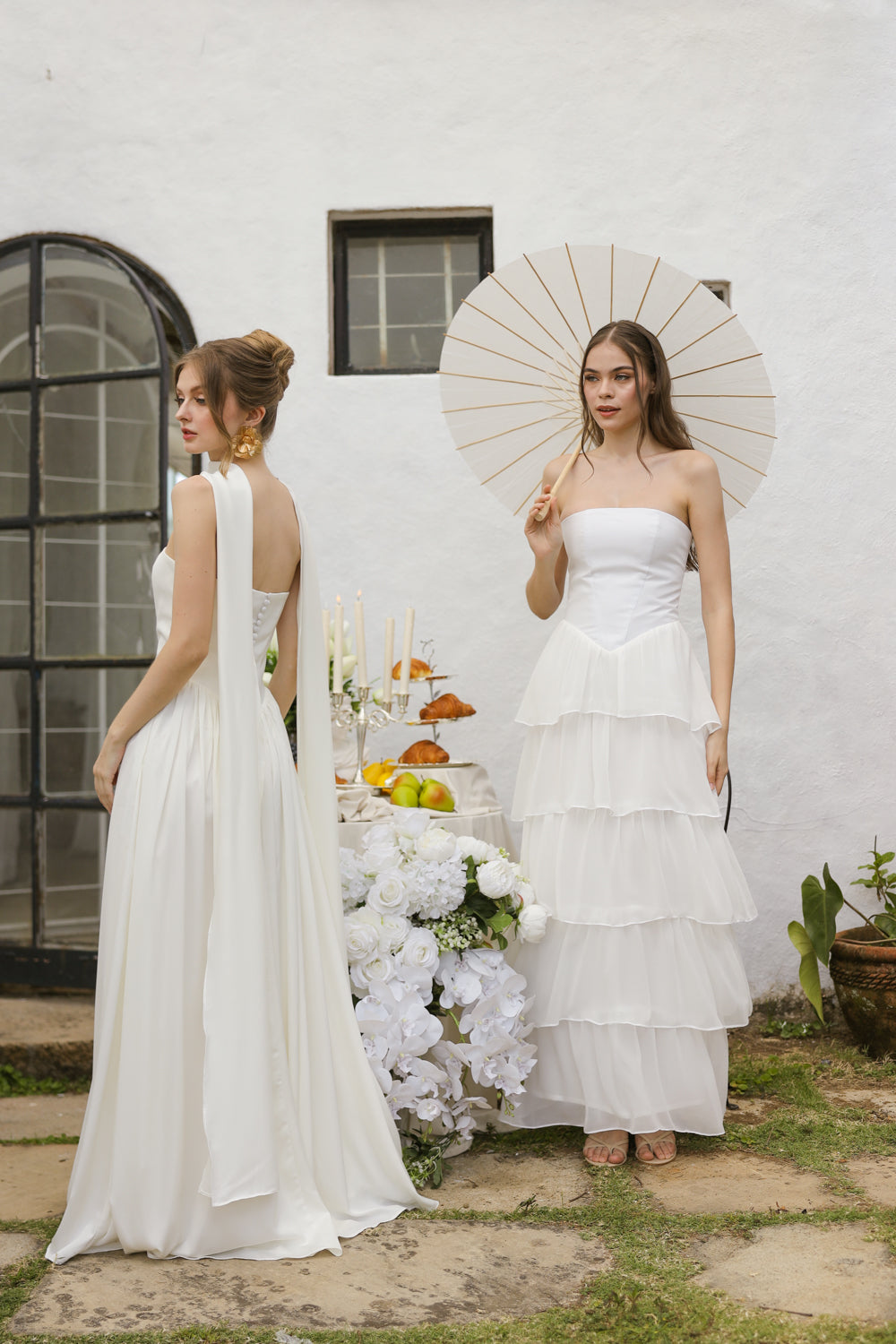 AURORA Strapless Drop Waist Maxi Dress with Layered Skirt (Ivory White Chiffon)