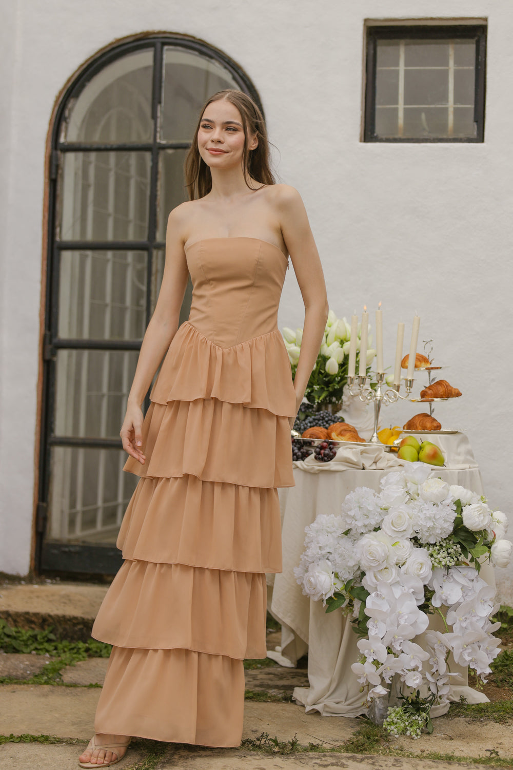 AURORA Strapless Drop Waist Maxi Dress with Layered Skirt (Nude Chiffon)