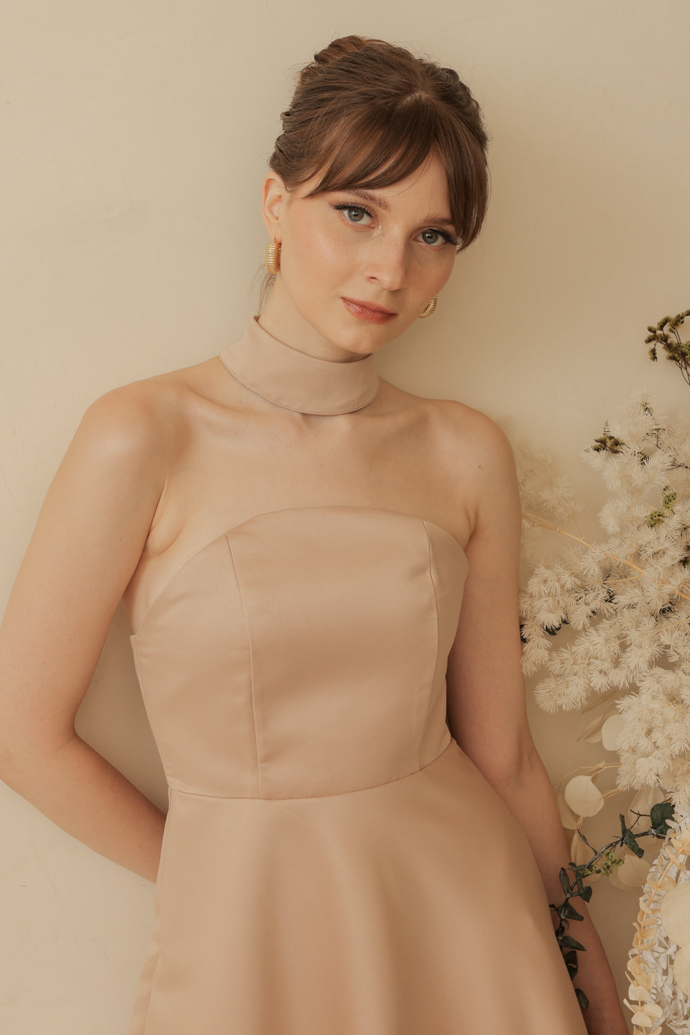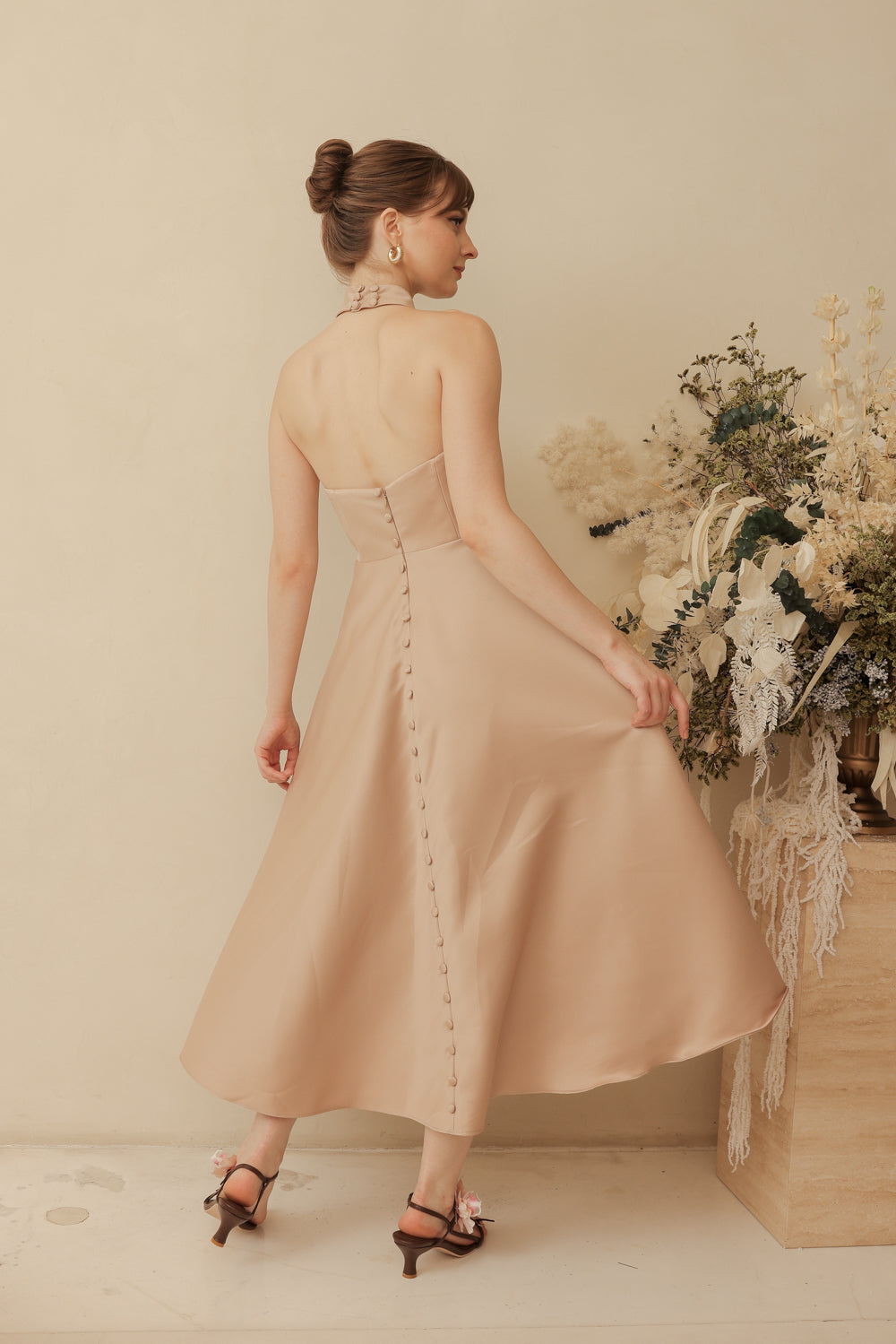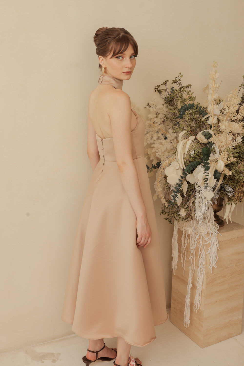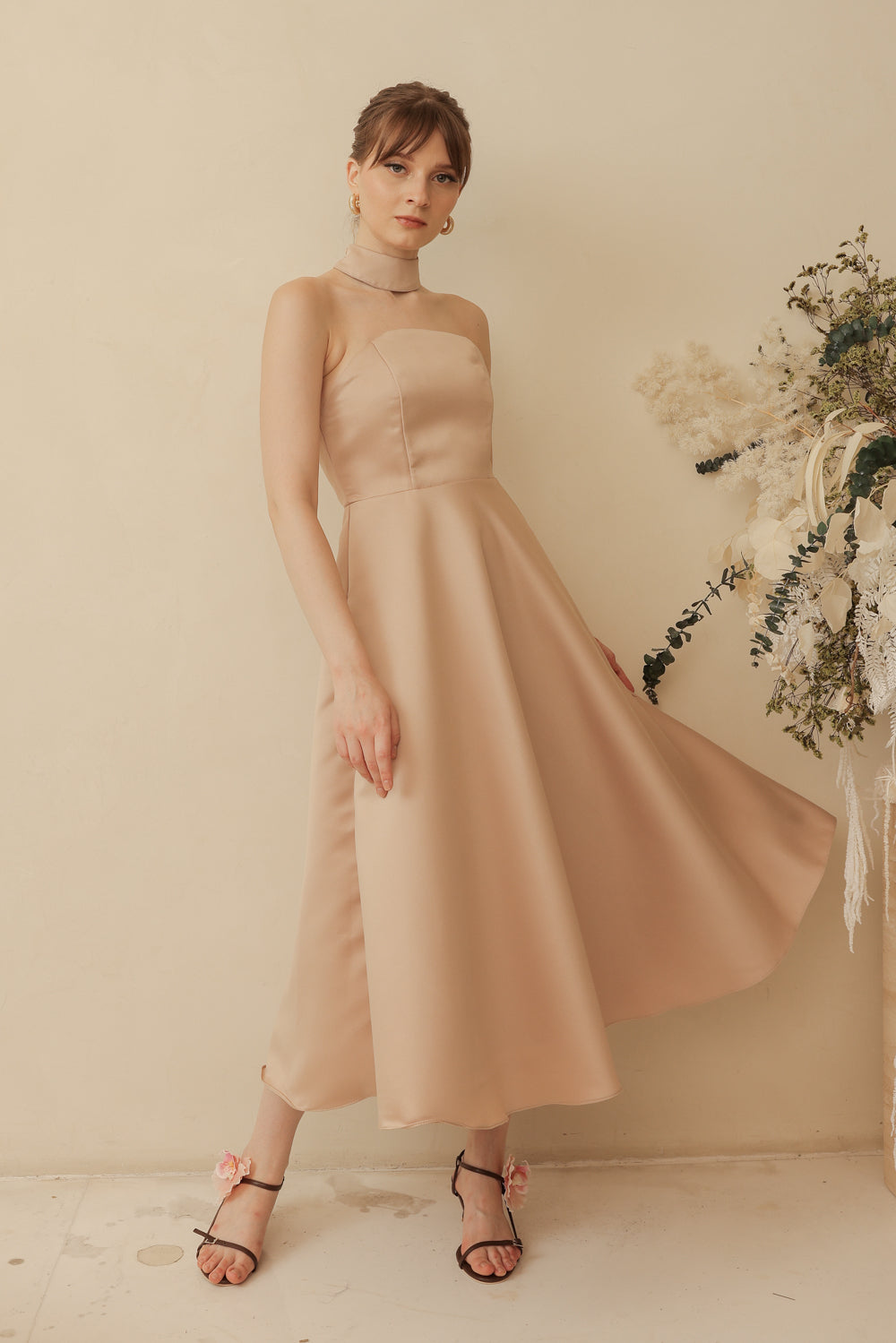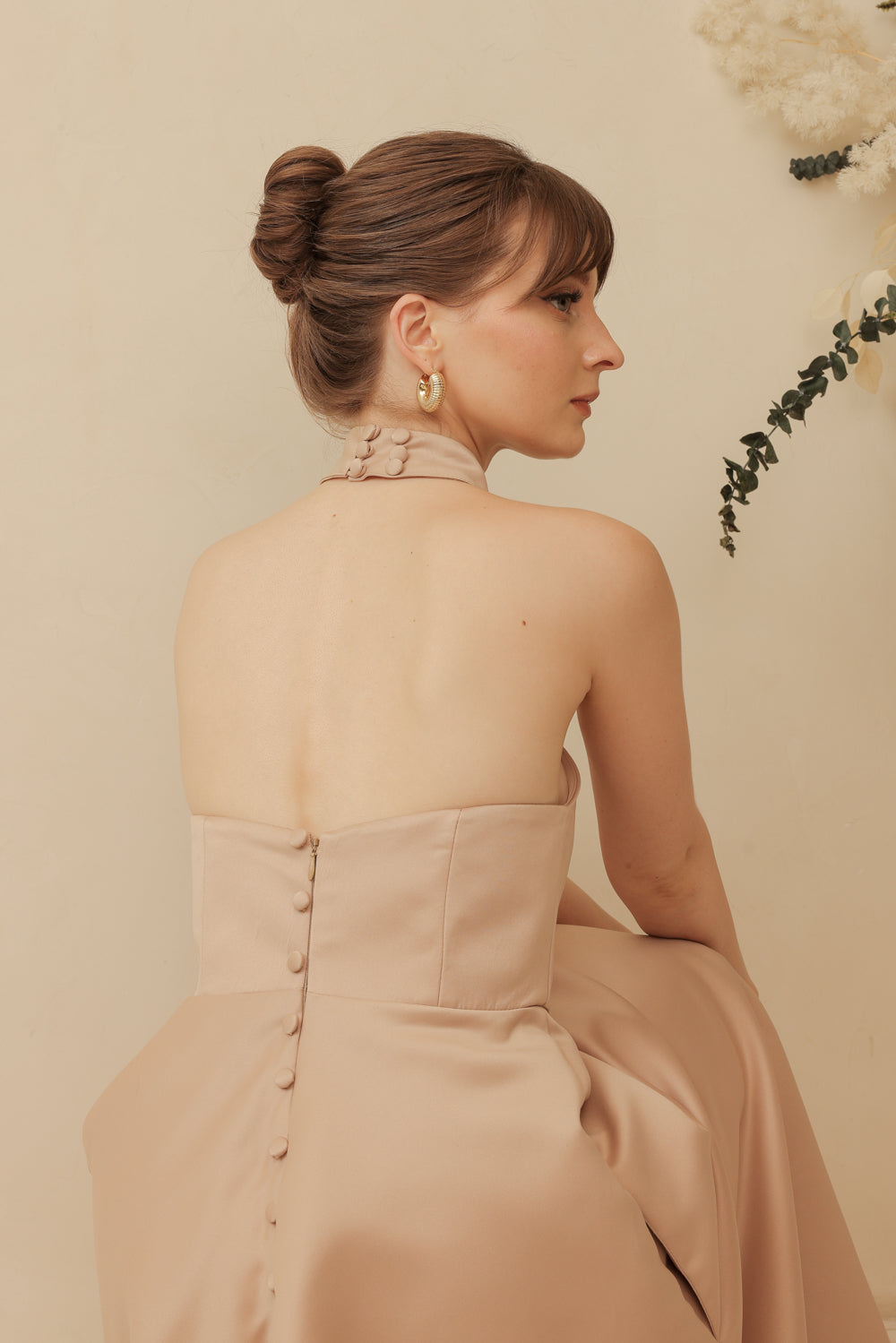 BRIELLE Curve Neckline Midi Dress with Full Covered Button Back and Tie Neckpiece (Tan Duchess Satin)