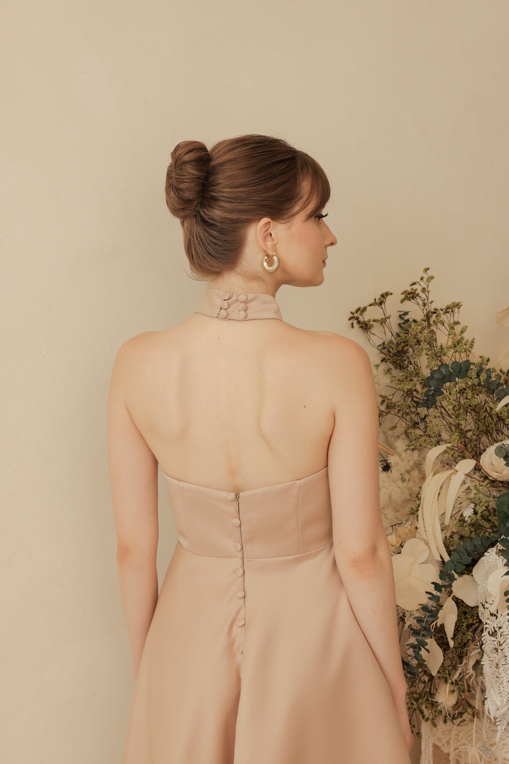 For the charming wedding guest. The Brielle dress is a curve neckline dress filled with covered button detail at the back and finished with a tie neckpiece.